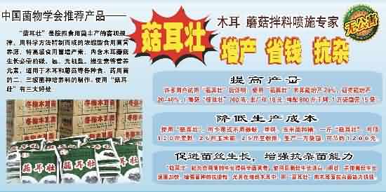 许多用户试用“菇耳壮”后证明:使用“菇耳壮”,木耳能增产20%,平菇等能增产20-40%。(每袋“菇耳壮”700克,出厂价19元,可配800斤干料,1万袋菌需15-16袋)